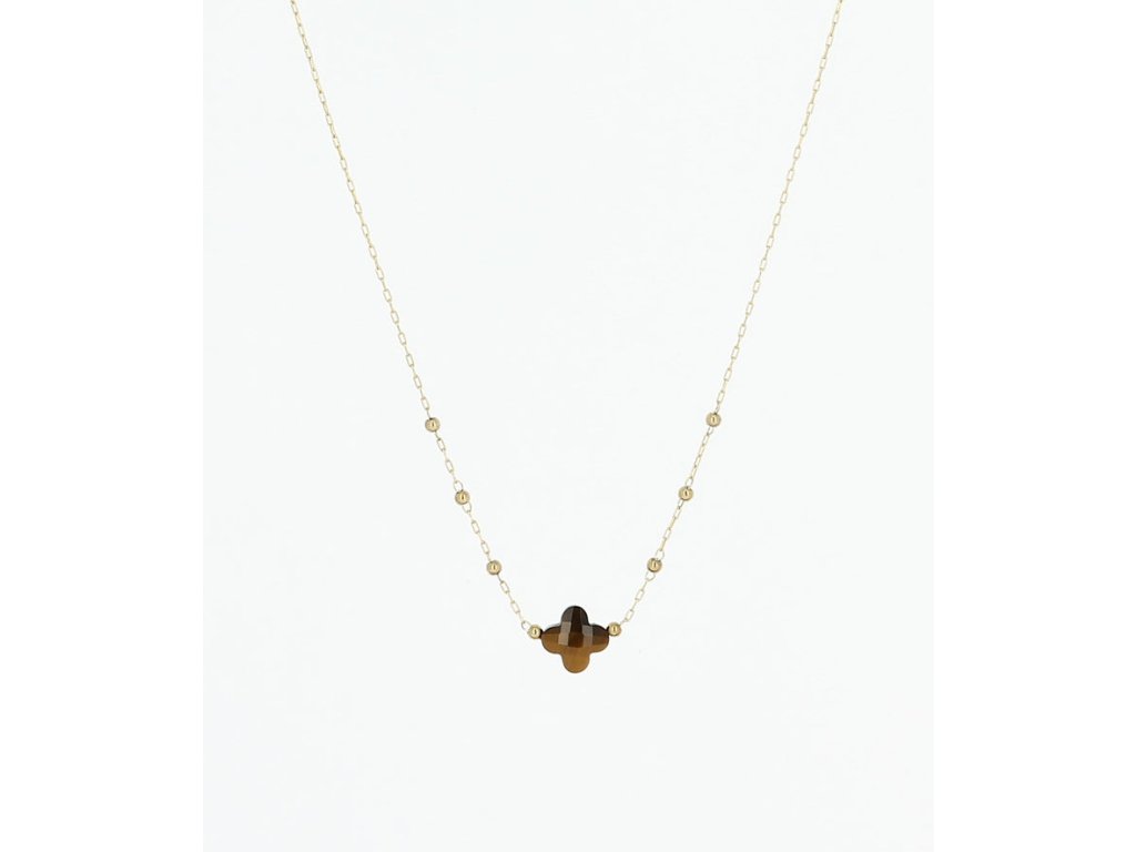 Retiazkový náhrdelník "ruženec" z ocele pozlátený jemným zlatom, na ktorom je pripevnený prírodný kameň v tvare malej ďateliny.