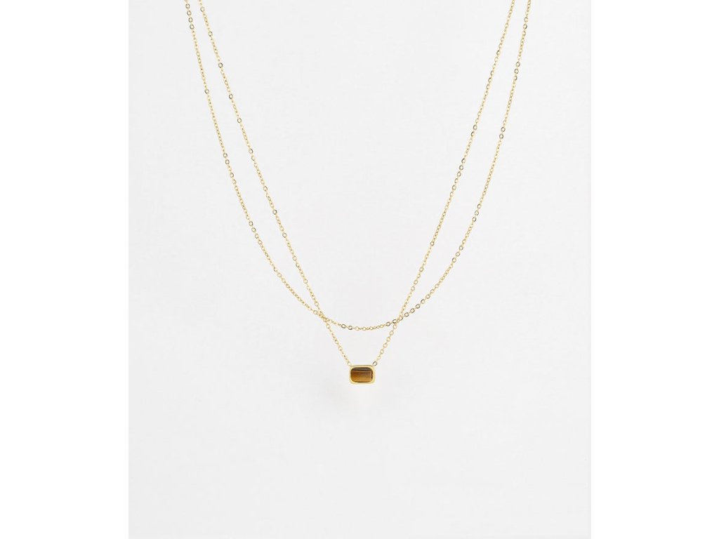 Dvojradový náhrdelník z pozlátenej ocele. Skladá sa z jednoduchého radu a radu ozdobeného malým prírodným kameňom v tvare obdĺžnika.