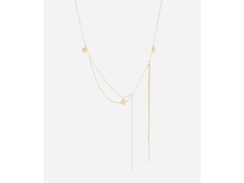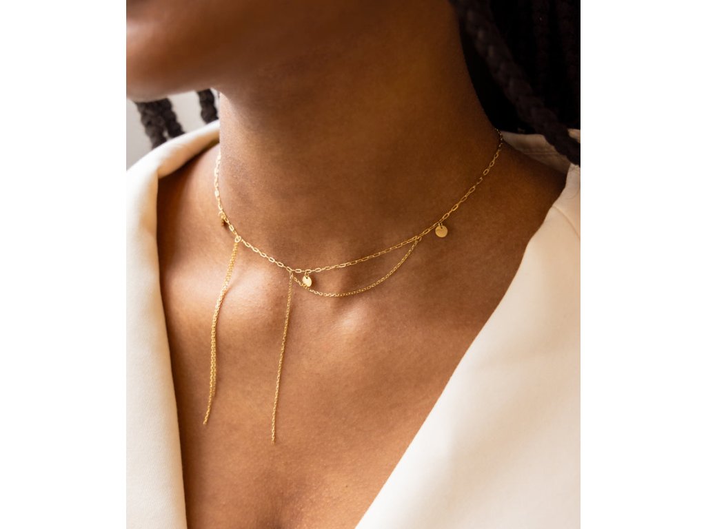 Náhrdelník z ocele pozlátený s retiazkami visiacimi vpredu. Je tiež osadený malými oceľovými príveskami.