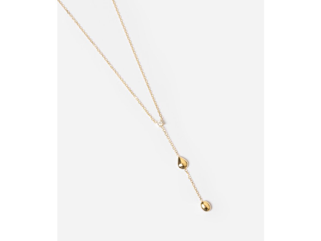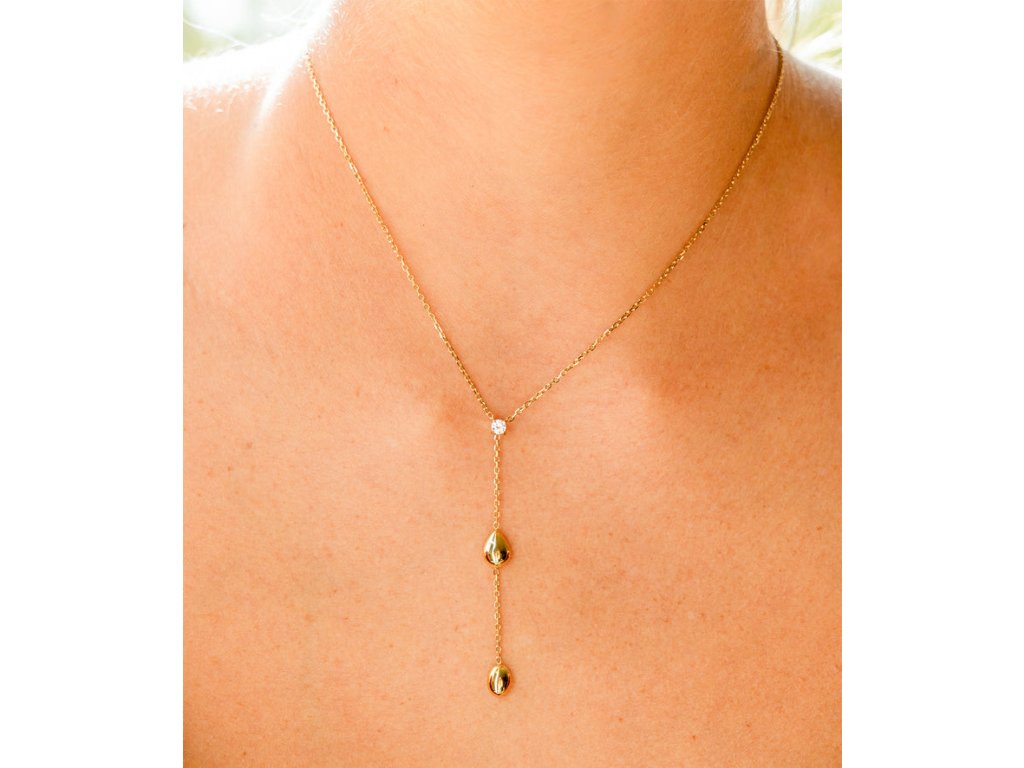 Náhrdelník z pozlátenej ocele, osadený zirkónom, na konci ktorého je retiazka spojená s dvoma oceľovými kvapkami.