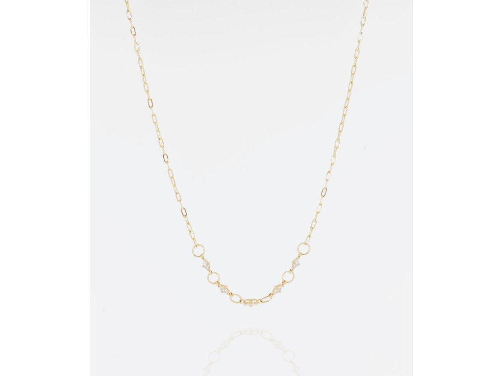 Ikonický náhrdelník z ocele pozlátený jemným zlatom, posiaty malými obdĺžnikovými zirkónmi.