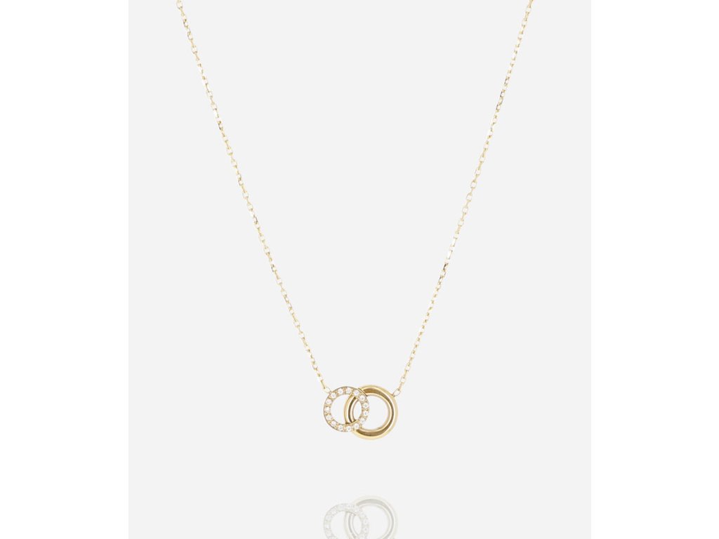 Náhrdelník z hladkej ocele pozlátený s dvoma prekrývajúcimi sa krúžkami, z ktorých jeden je osadený zirkónmi.