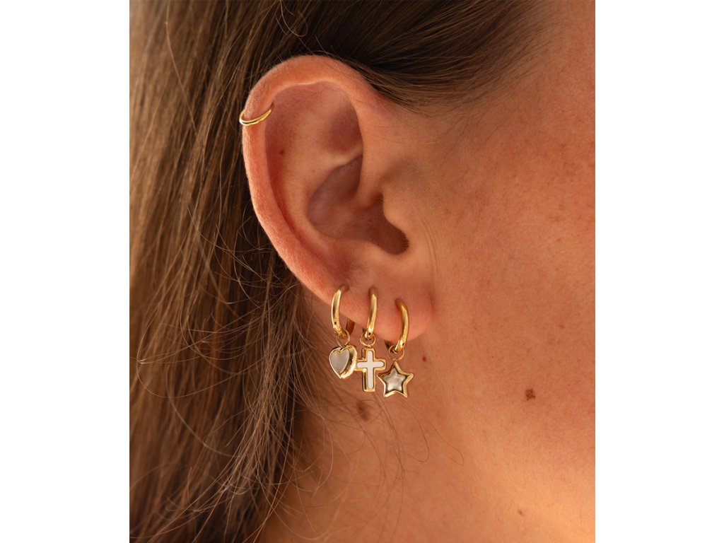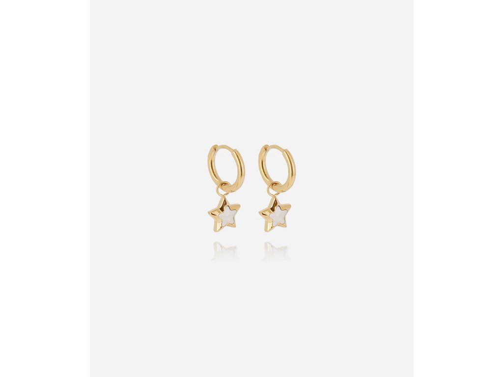 Mini kruhové náušnice z ocele, pozlátené jemným zlatom, na ktorých je zavesená hviezda osadená perleťou.