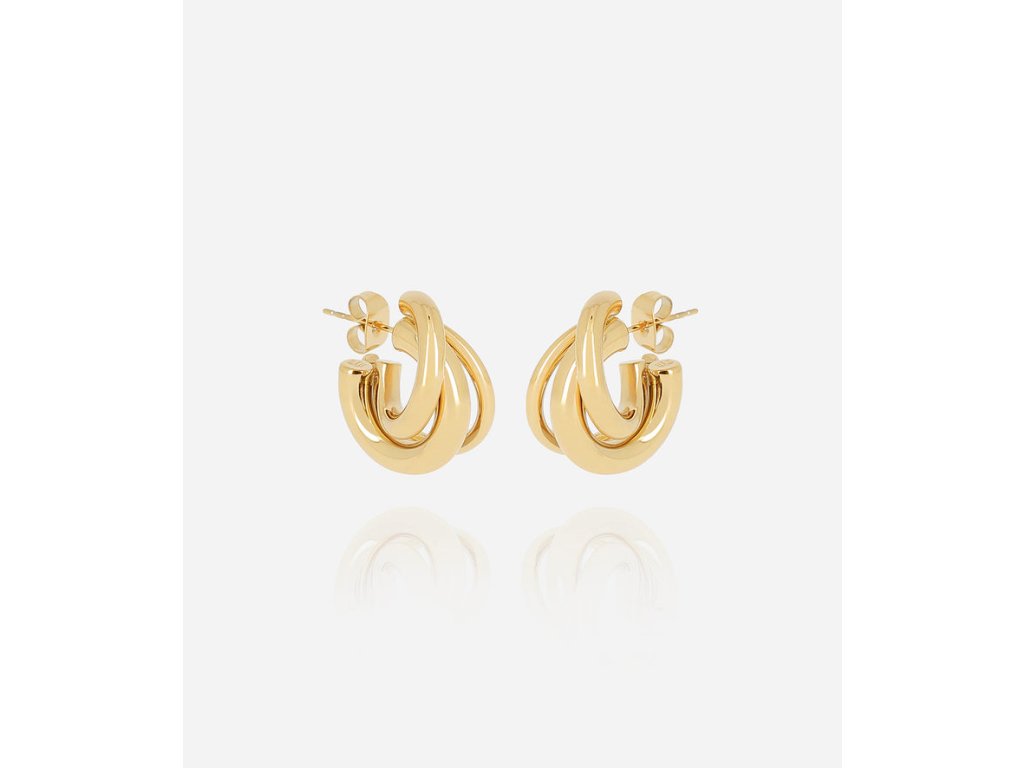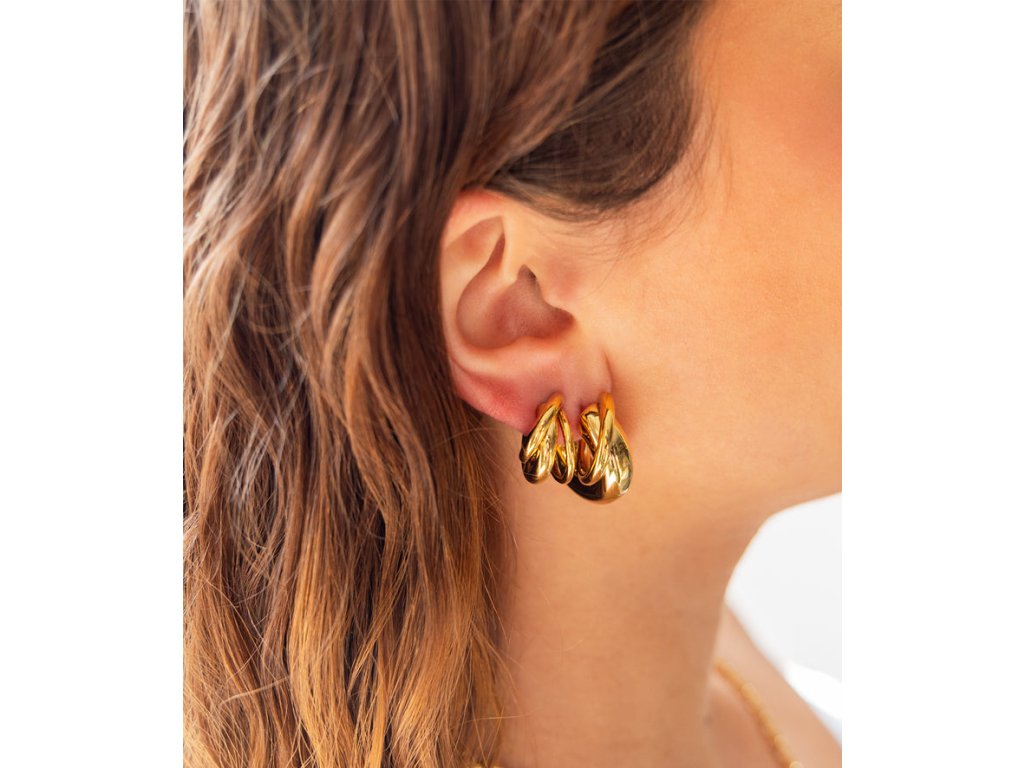 Náušnice z hladkej ocele pozlátené jemným zlatom, zložené z 3 krúžkov rôznych veľkostí a hrúbok.
