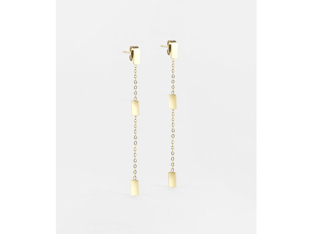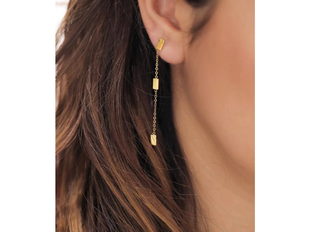 Dlhé náušnice z pozlátenej ocele s jednoduchou retiazkou, na ktorej sú zavesené kovové obdĺžniky.
