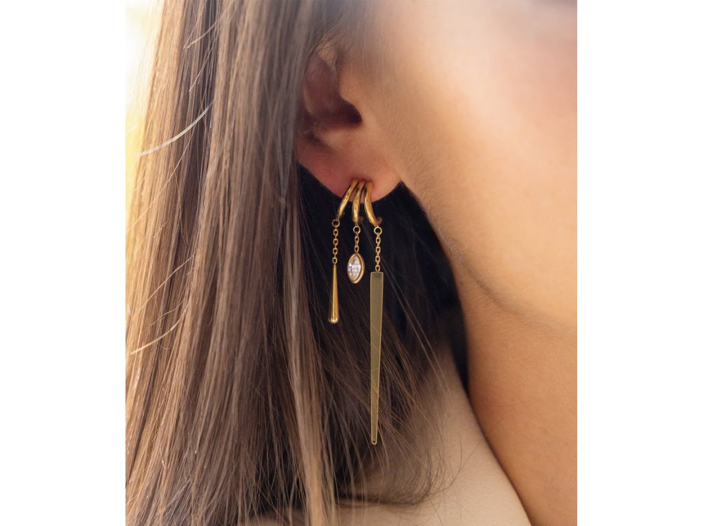 Kruhové náušnice z hladkej pozlátenej ocele s jemnou ionizáciou zlata. Skladajú sa z 3 polkruhov, na ktorých koncoch sú osadené 3 prívesky: oválny zirkón, predĺžený oceľový trojuholník a predĺžená oceľová kvapka.
