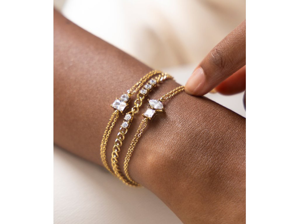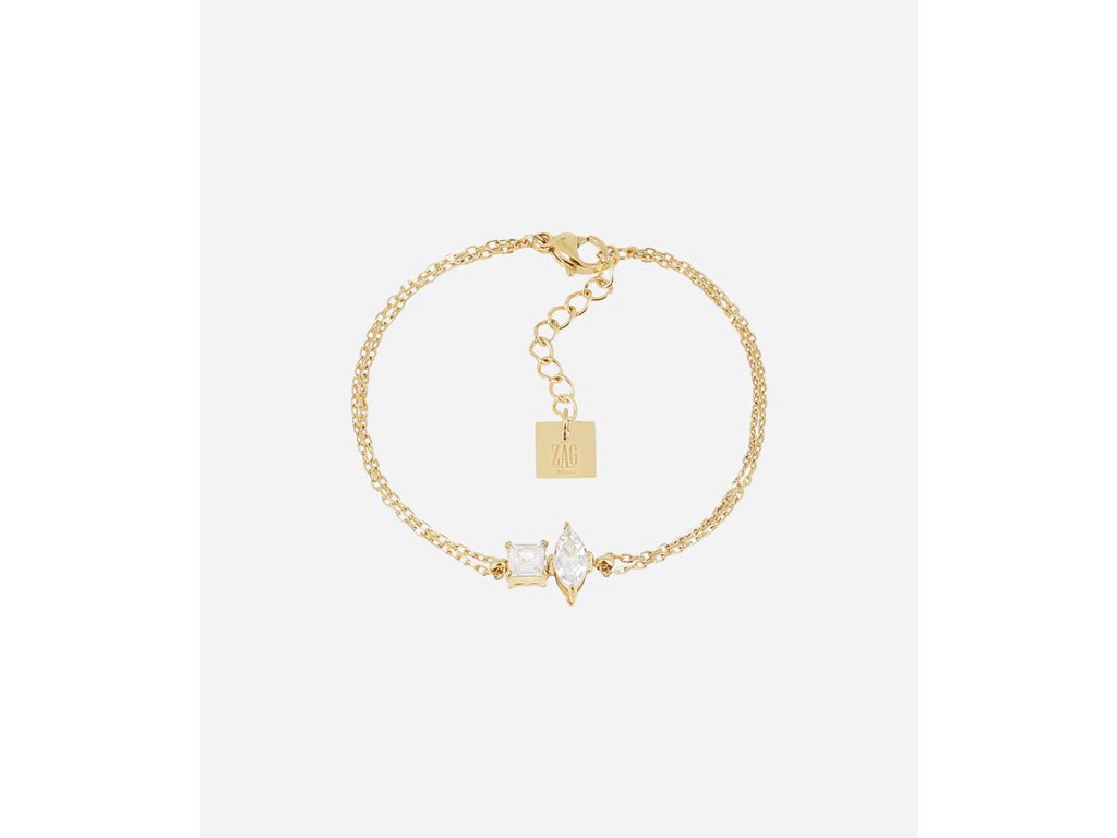 Dvojitý náramok z pozlátenej ocele so štvorcovým zirkóniovým kameňom a oválnym zirkóniovým kameňom.