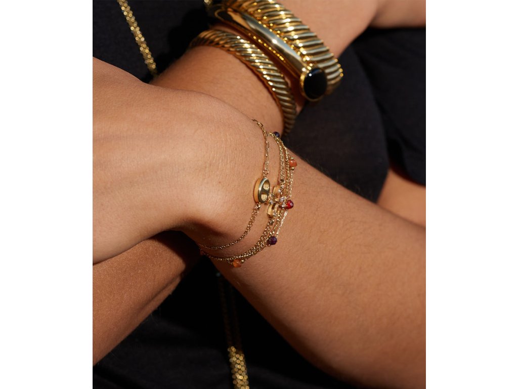 Dvojradový náramok z ocele, pozlátený jemným zlatom, po celej dĺžke vsadené perly a farebné guličky.