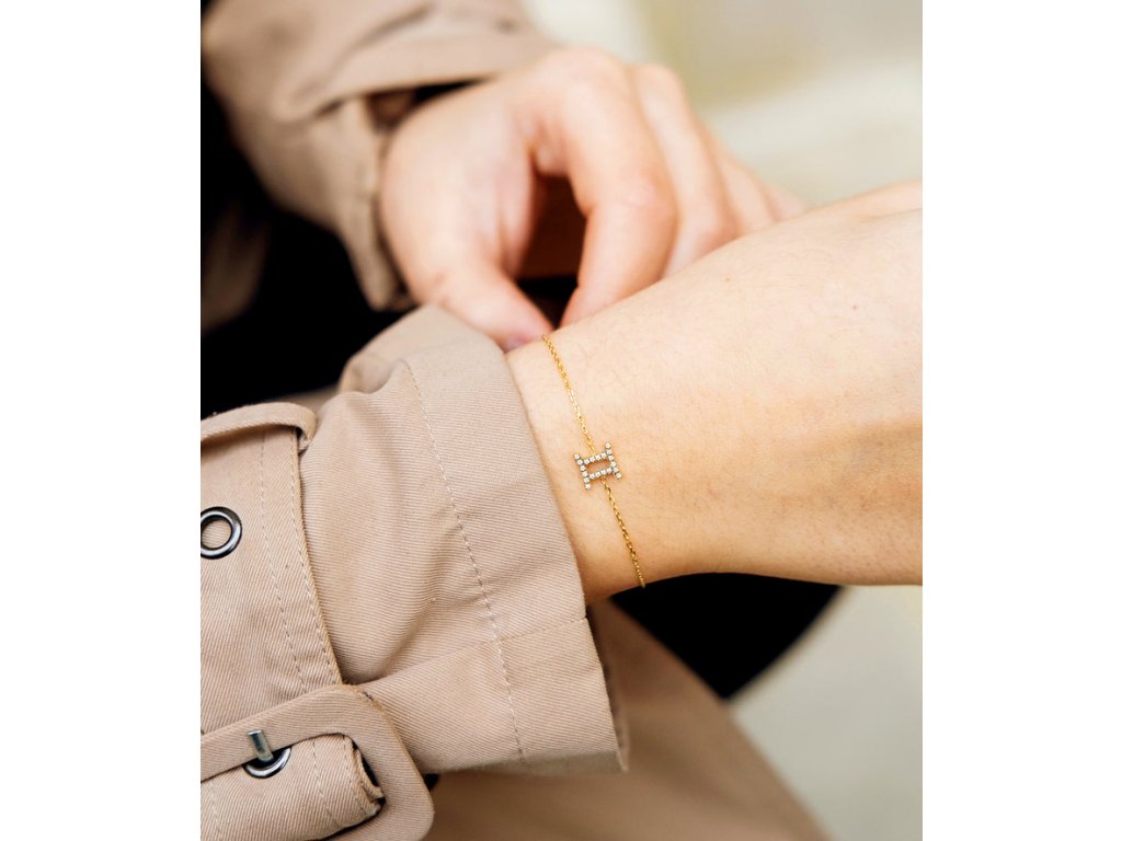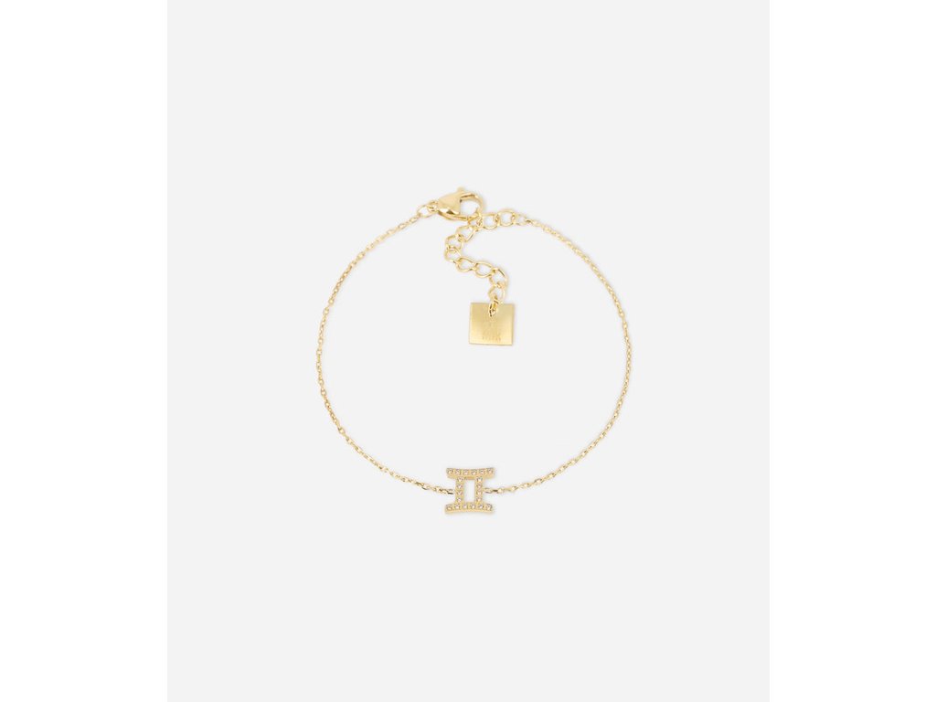 Pozlátený oceľový náramok s motívom predstavujúcim znamenie zverokruhu Blíženci, osadený zirkónmi.
