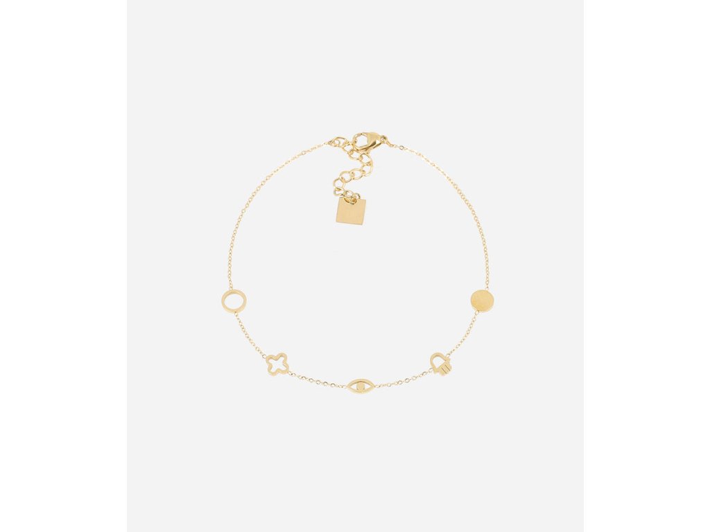 Retiazka na členok z hladkej ocele pozlátená s geometrickými vzormi, okom, rukou a ďatelinou.