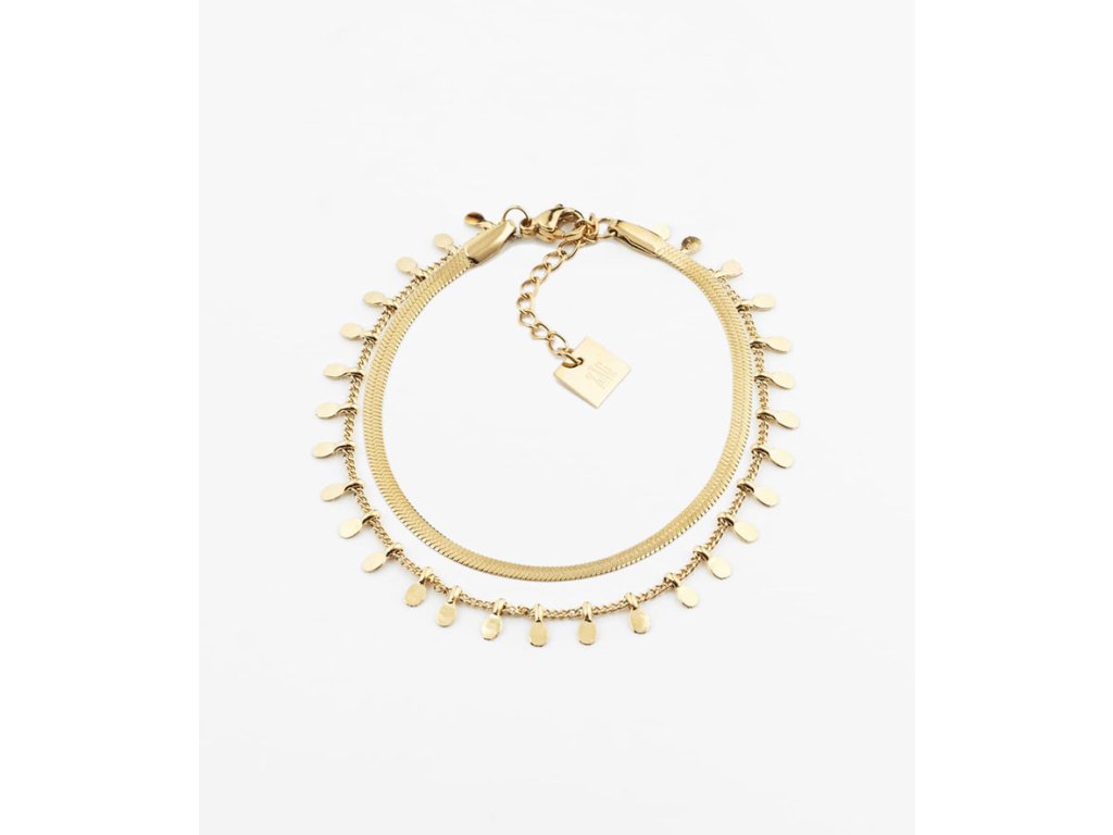 Náramok s dvojitou retiazkou z ocele pozlátený jemným zlatom s radom kovových príveskov.