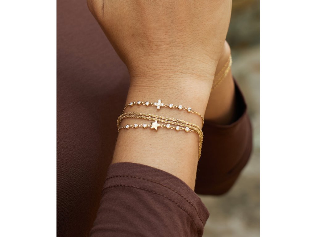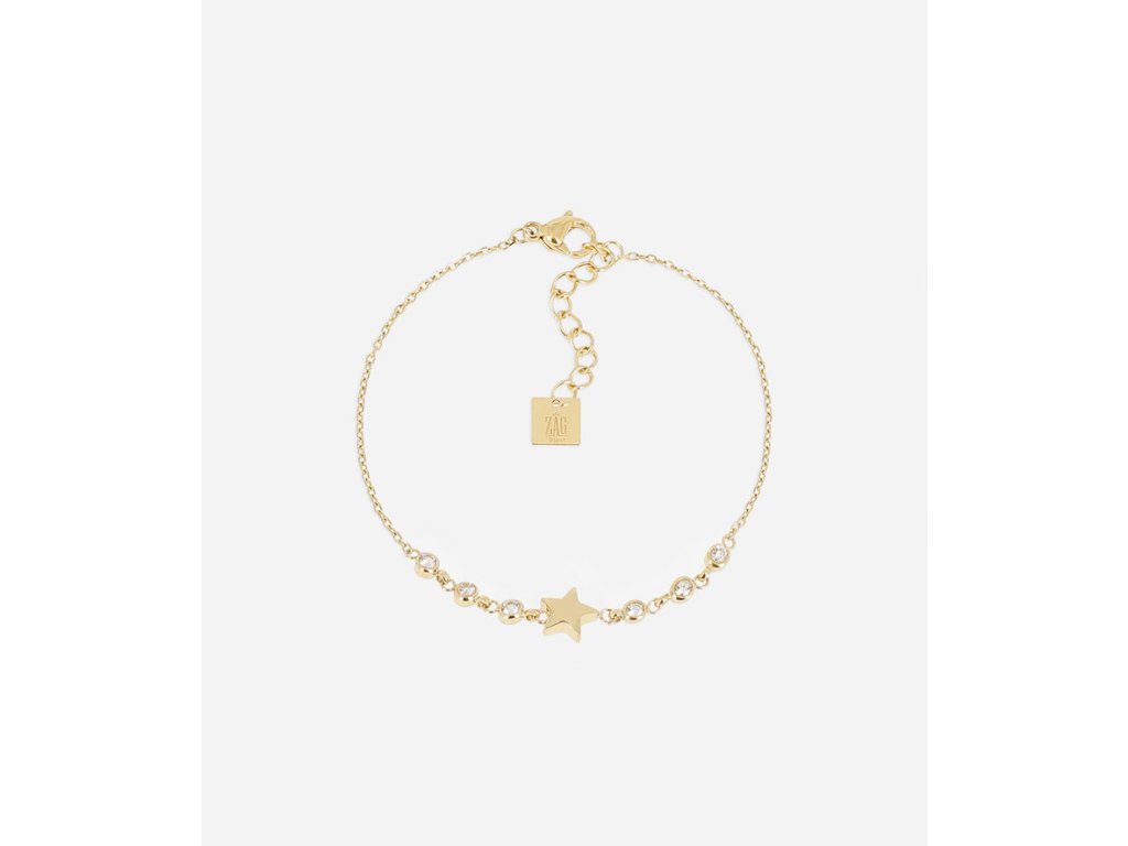Náramok z jemne pozlátenej ocele s príveskom v tvare hviezdy. Na retiazke sú osadené okrúhle zirkóny.