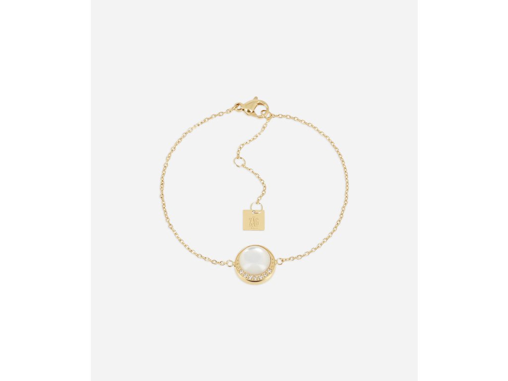 Náramok z hladkej nehrdzavejúcej ocele pozlátený ionizáciou s okrúhlym príveskom osadeným perleťou a zirkónmi.