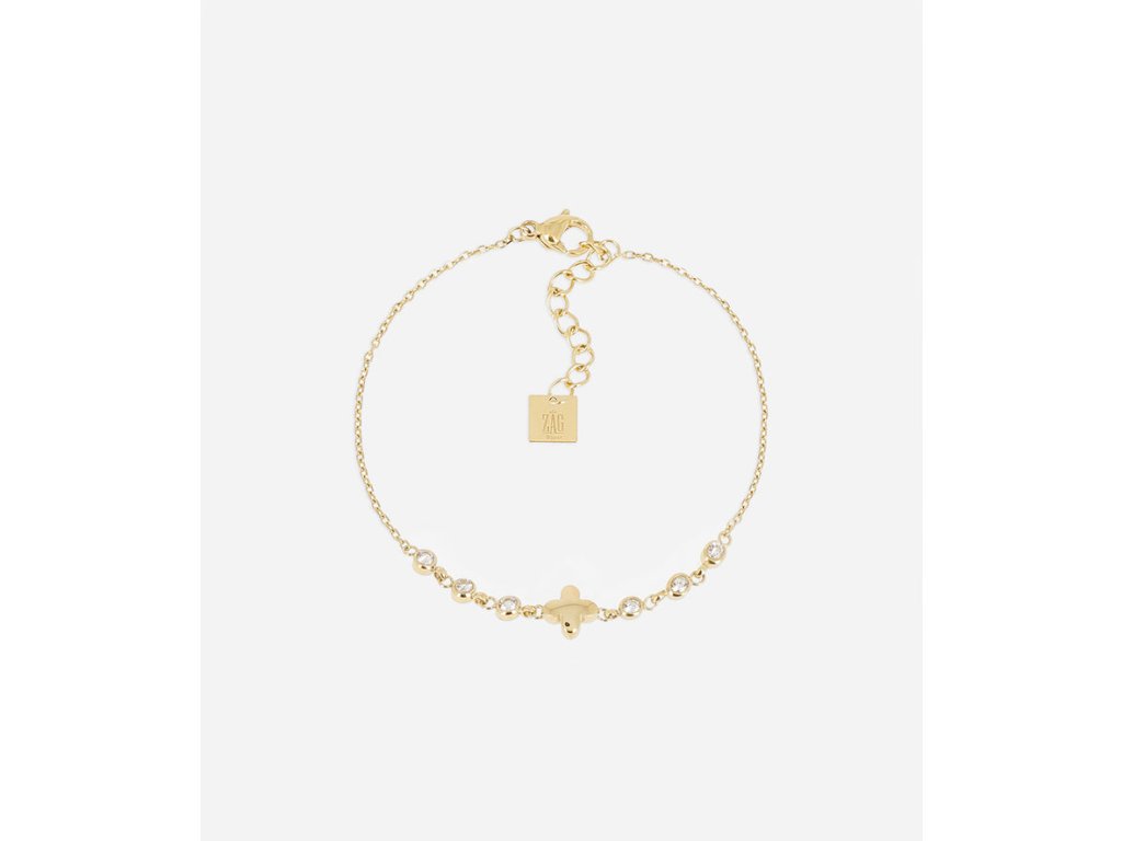 Náramok z hladkej pozlátenej ocele s príveskom v tvare ďateliny. Na retiazke sú osadené okrúhle zirkóny.