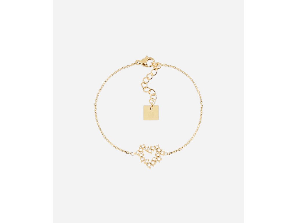 Náramok z hladkej pozlátenej ocele osadený príveskom v tvare srdca osádzaným zirkónovými kameňmi.