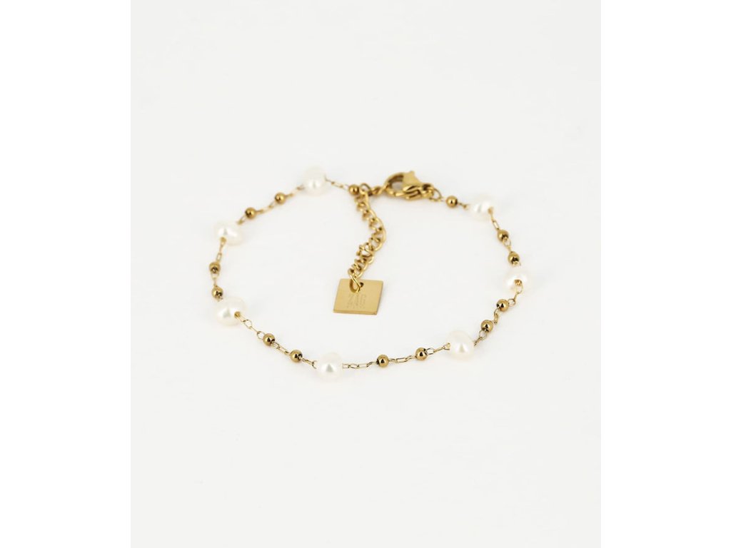 Oceľový retiazkový náramok pozlátený jemným zlatom, dokola biele perly a jemné pozlátené guličky.
