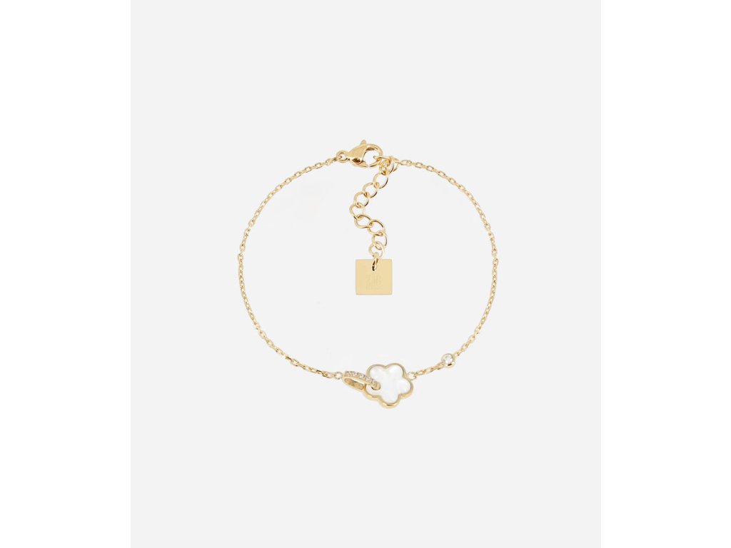 Náramok z pozlátenej ocele osadený perleťovým kvetom a prsteňom osadeným zirkónovými kameňmi.