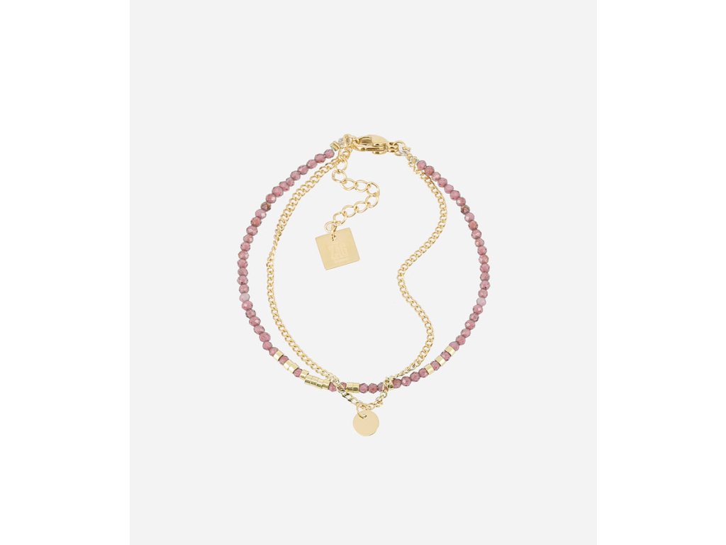 Dvojradový náramok z ocele pozlátený rýdzym zlatom. Prvý rad tvorí šnúrka z prírodných kameňov zmiešaná s kovovými prísadami a druhý je malá klasická retiazka.