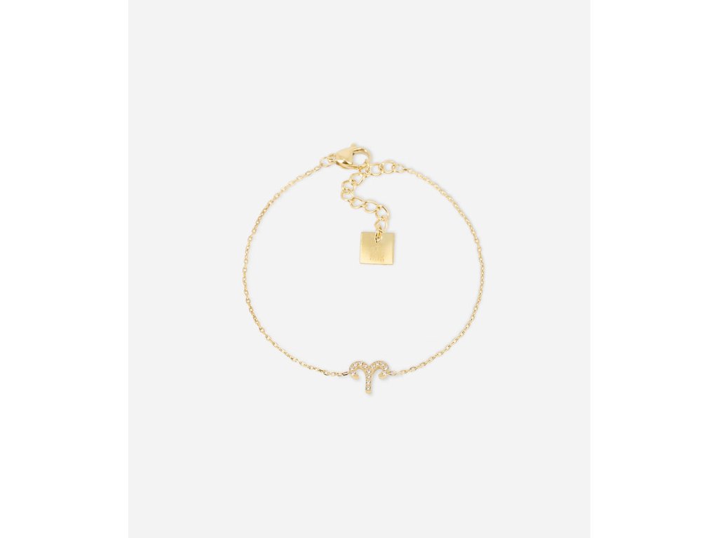 Oceľový náramok pozlátený jemným zlatom, na ktorom je pripevnený motív predstavujúci znamenie zverokruhu Baran, osadený zirkónmi.