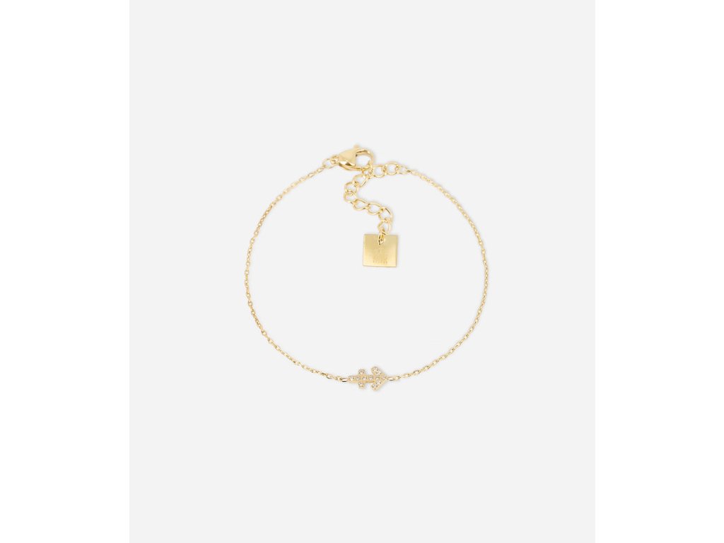 Pozlátený oceľový náramok s motívom predstavujúcim znamenie zverokruhu Strelec, osadený zirkónmi.