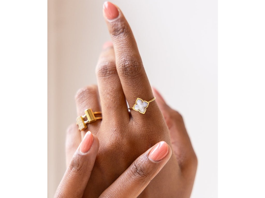 Prsteň z pozlátenej ocele osadený príveskom v tvare lotosu z perlete, ktorý predstavuje čakru.
