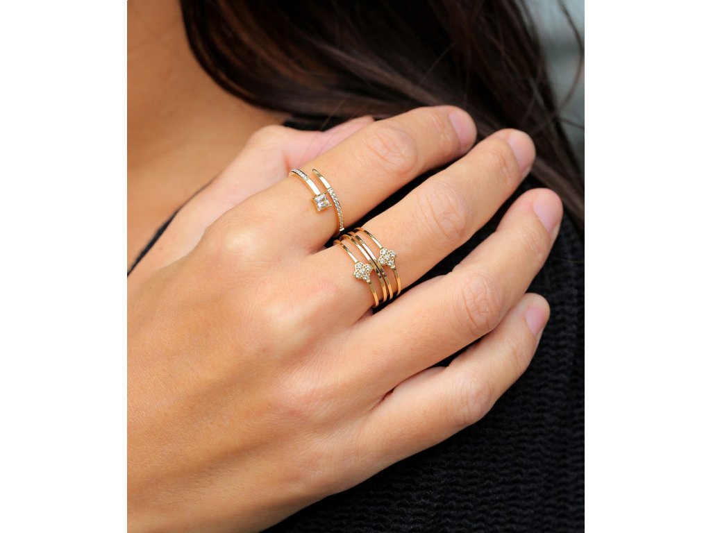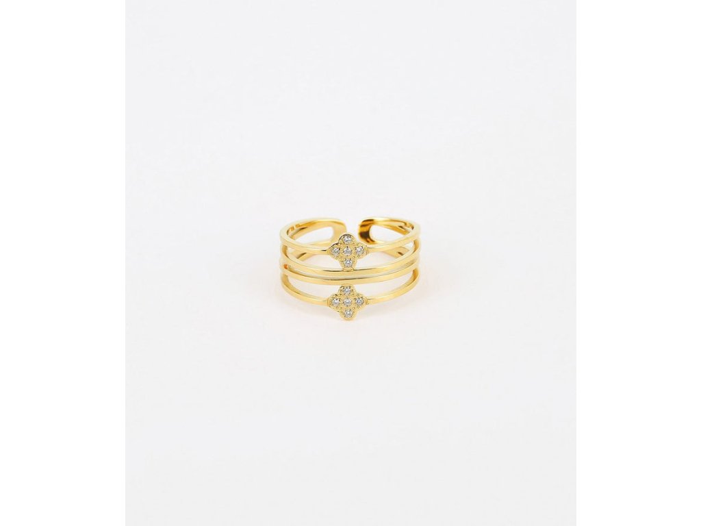 Nastaviteľný prsteň z ocele pozlátený jemným zlatom. Tento prsteň je vyrobený z niekoľkých krúžkov spojených dvoma štvorlístkami so zirkónmi.