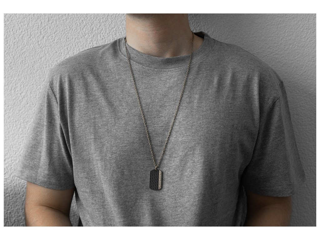 Tento elegantný a nadčasový náhrdelník tvorí jeden klasický dogtag prívesok, ktorý pôsobí moderne, čisto a zároveň výrazne mužsky. Na prednej strane sa nachádza detail z čierneho karbónu, ktorý dodáva prívesku technický a luxusný vzhľad. Zadná strana je doplnená o jemné logo Aze, decentne a precízne spracované.