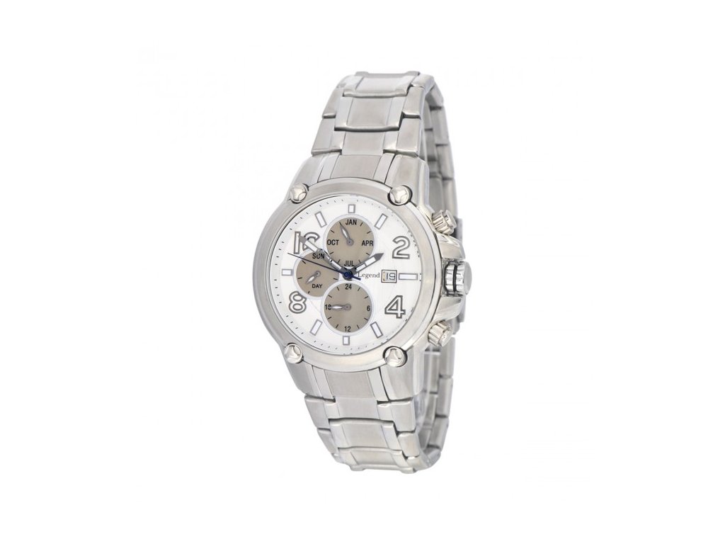 Elegantné pánske hodinky LEGEND 1H354chrv striebornom tóne. Najvýraznejšou časťou hodín je zaujímavo riešený ciferník so štyrmi skrutkami a dymovo sivým chronografom. Na bielom podklade sú okrem chronografu a dátumovky tiež výrazné ručičky a číselník s luminiscenciou. Biela farba dodáva masívnemu spracovaniu a výraznej korunke ľahkosť. Hodinky sú vyrobené z nerezovej chirurgickej ocele bez obsahu vedľajších kovov, vhodné aj pre citlivú pokožku.