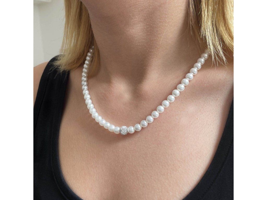 Perlový náhrdelník 32063.1 v dĺžke 45+5 cm je poskladaný z malých bielych perál, medzi ktoré je navlečená gulička vysadená mnohými Preciosa krištáľmi v bielej farbe. Na zapínanie náhrdelníka bolo použité striebro rýdzosti 925/1000, ktoré prešlo úpravou ródiom. Ródium striebro ochráni proti sčernaniu, zožltnutiu i poškriabaniu. Náhrdelník je vhodný aj pre alergikov , neobsahuje totiž nikel.