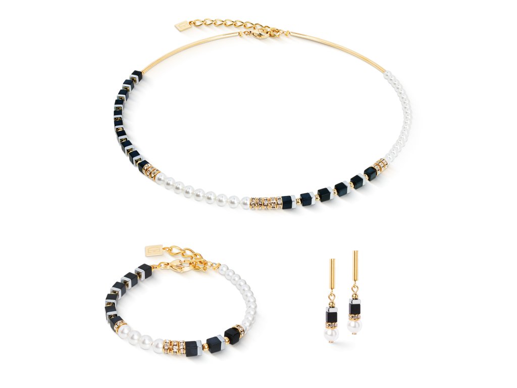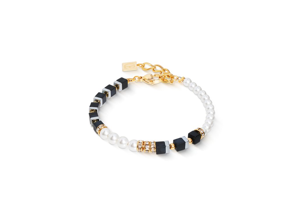 Náramok Precious Fusion Offset black-pearl prináša dokonale vyváženú harmóniu čiernej a bielej. Kocky z onyxu a rafinovaného hematitu sa spájajú s trblietavými Swarovski® Crystal Pearls a žiarivými krištáľmi, pričom dizajn dopĺňajú detaily z nerezovej ocele v zlatej farbe.