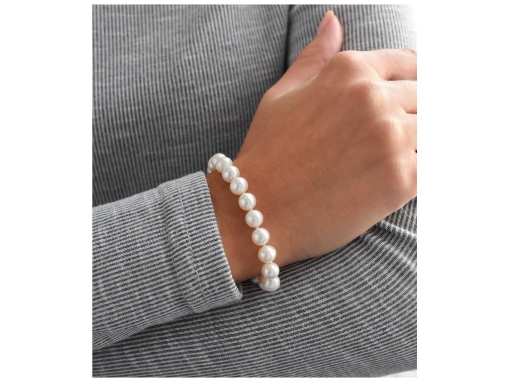 Perlový náramok 23007.1 o dĺžke 19,5 cm je zložený z celkom 19 guľatých riečnych periel veľkosti 7,5 - 8 mm v bielej farbe. Každá perla je zaistená uzlíkovou väzbou, a tak sa pri nechcenom pretrhnutí náramku nestane, že sa vám perly rozkotúľajú na všetky strany. Jedna perlička sa ešte ukrýva v zaujímavo riešenom striebornom zapínaní s bezpečnostnou poistkou. Striebro použité na zapínanie náramku má rýdzosť 925/1000 a ródiovú povrchovú úpravu. Náramok neobsahuje nikel, a tak ho môžu nosiť aj alergici.