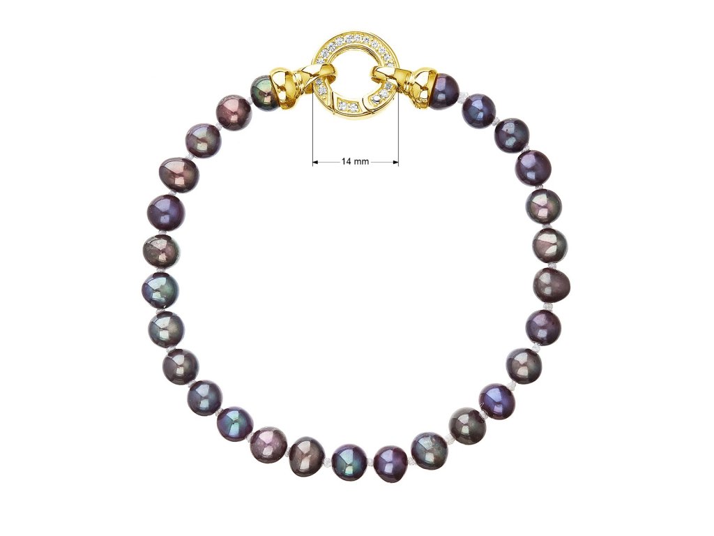 Chystáte sa na rodinný sviatočný obed? Doplňte svoj outfit o originálny jemný perlový náramok 23001.3 z modrofialových riečnych perál. Pre svoju jednoduchosť a eleganciu ho však nemusíte využívať len na sviatočnú udalosť, náramok môžete nosiť napríklad aj do práce. Perlový náramok s dĺžkou 19,5 cm je zložený z oválnych riečnych perál veľkosti 5,5 - 6 mm v úžasnej meniacej sa tmavo modrofialovej farbe. Každá perla je zaistená uzlíkovou väzbou , a tak sa pri nechcenom pretrhnutí náramku nestane, že sa vám perly rozkotúľajú na všetky strany. Zaujímavo riešené okrúhle pozlátené zapínanie zdobené niekoľkými trblietavými zirkónmi dodáva náramku na elegancii. Striebro použité na zapínanie má rýdzosť 925/1000. Náramok neobsahuje nikel , a tak ho môžu bez obáv nosiť aj alergici.
