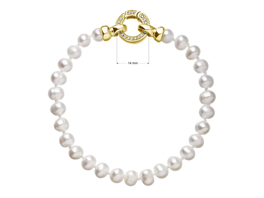 Perlový náramok s dĺžkou 19,5 cm je zložený z oválnych riečnych perál veľkosti 5,5 - 6 mm v bielej farbe. Každá perla je zaistená uzlíkovou väzbou , a tak sa pri nechcenom pretrhnutí náramku nestane, že sa vám perly rozkotúľajú na všetky strany. Zaujímavo riešené okrúhle pozlátené zapínanie zdobené niekoľkými trblietavými zirkónmi dodáva náramku na elegancii. Striebro použité na zapínanie má rýdzosť 925/1000. Náramok neobsahuje nikel , a tak ho môžu bez obáv nosiť aj alergici.