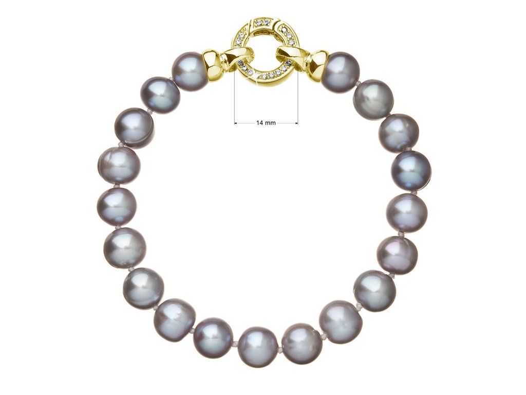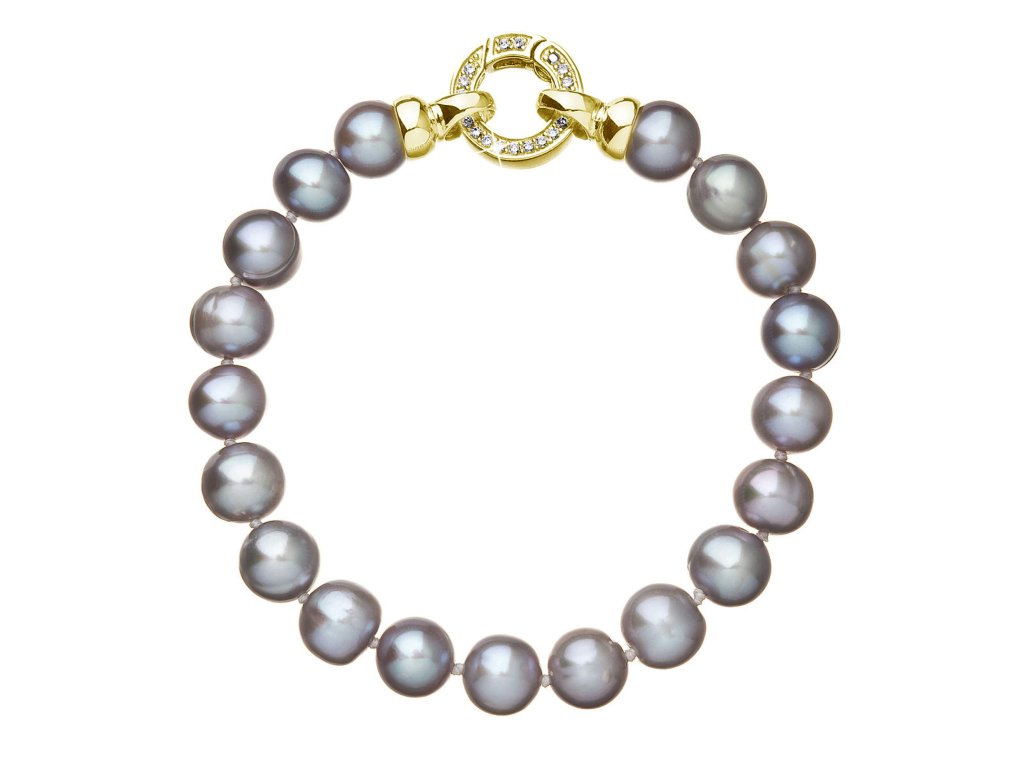 Perlový náramok 23010.3 o dĺžke 19,5 cm je zložený z takmer okrúhlych riečnych perál veľkosti 8 - 8,5 mm v šedej farbe. Každá perla je zaistená uzlíkovou väzbou , a tak sa pri nechcenom pretrhnutí náramku nestane, že sa vám perly rozkotúľajú na všetky strany. Zaujímavo riešené okrúhle pozlátené strieborné zapínanie zdobené niekoľkými trblietavými zirkónmi dodáva náramku na elegancii. Striebro použité na zapínanie má rýdzosť 925/1000. Náramok neobsahuje nikel , a tak ho môžu bez obáv nosiť aj alergici.