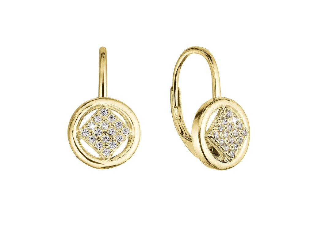 Pozlátené strieborné náušnice okrúhleho tvaru. V samom strede okrúhleho tvaru sa nachádza kosoštvorec, ktorý je vysadený zirkónmi. Tieto malé zirkóny tvoria centrálny bod záujmu, žiariaci jemným svetlom . Tento dizajnový prvok pridáva náušniciam šmrnc.