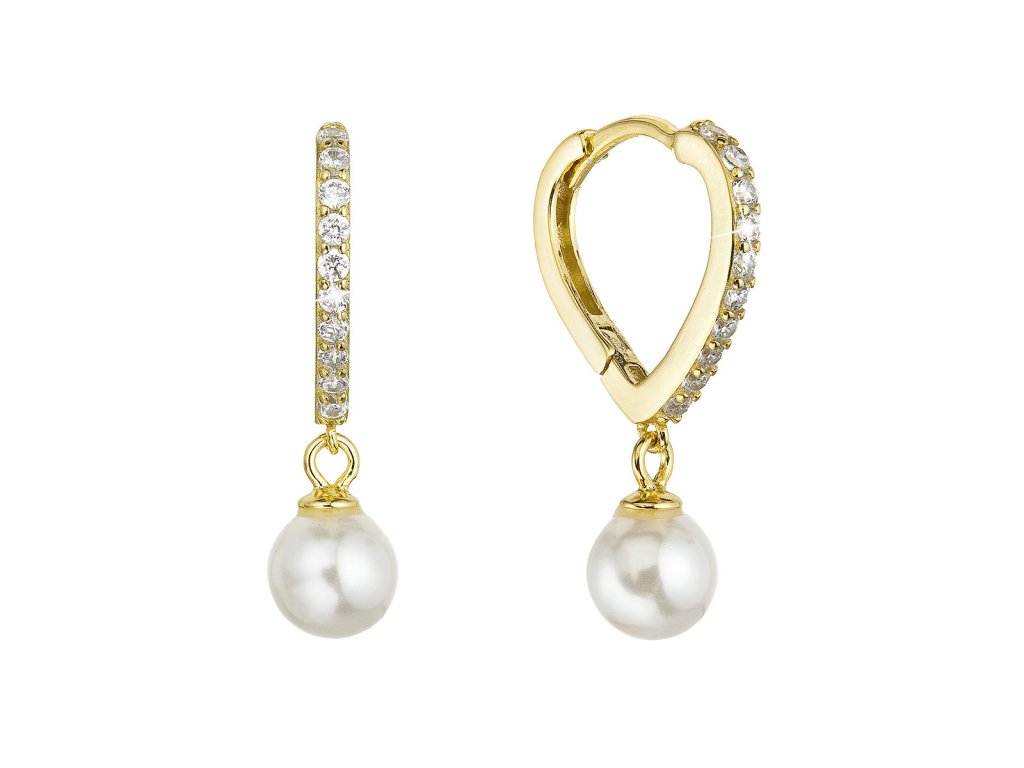 Pozlátené strieborné náušnice srdca so zirkónmi a visiacou perličkou shell 11426.1 Au plating