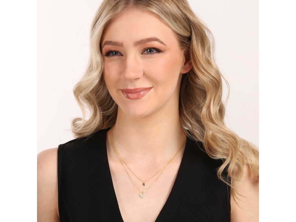 Pozlátený dvojradový náhrdelník 12153.1 očarí jemným a romantickým dizajnom, ktorý elegantne kombinuje dve retiazky v jednom šperku . Kratšiu retiazku zdobí drobné hladké srdiečko, zatiaľ čo na dlhšom sa vyníma väčšie srdce vysadené trblietavými zirkónmi. Vďaka vrstvenému efektu pôsobí šperk moderne a zároveň veľmi žensky – ideálny na každodenné nosenie i slávnostné chvíle.