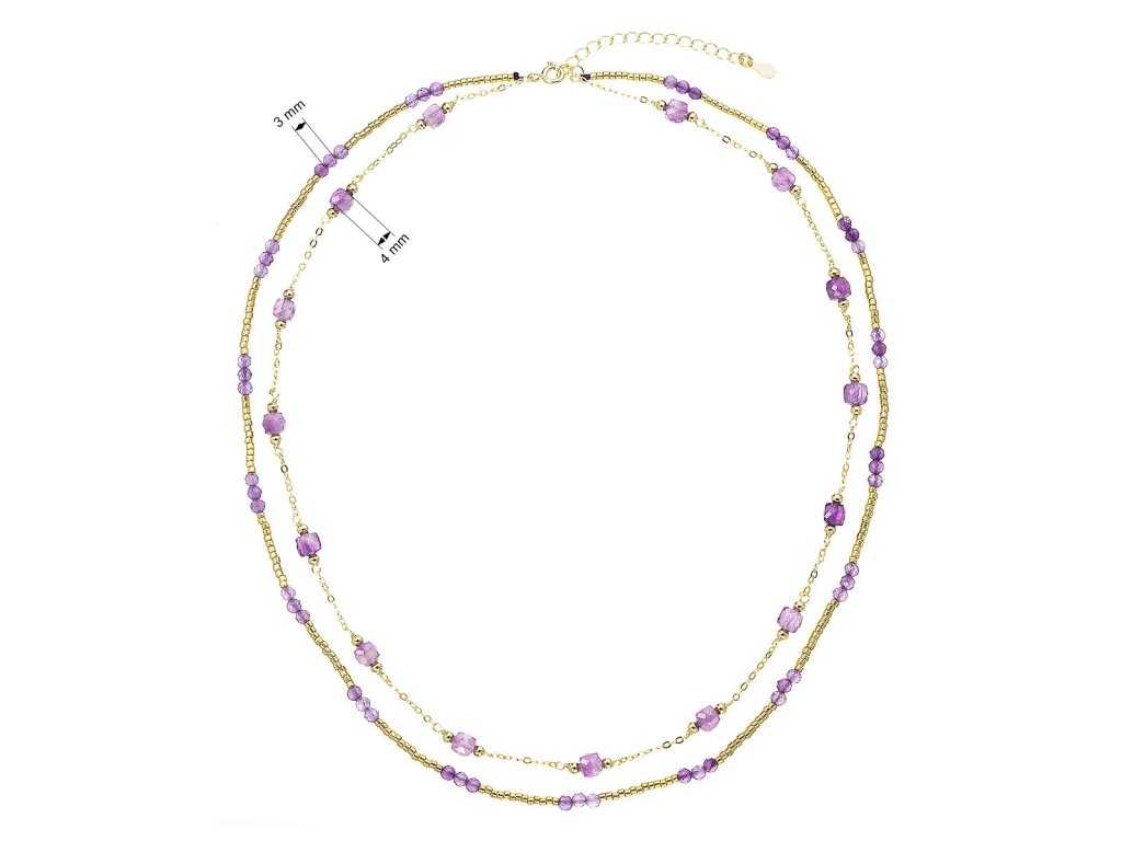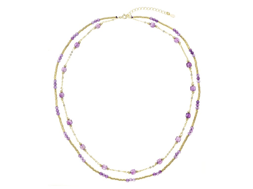 Očarujúce jemný dvojradový náhrdelník s drobnými prírodnými kamienkami ametystmi pôsobí ľahko a elegantne.