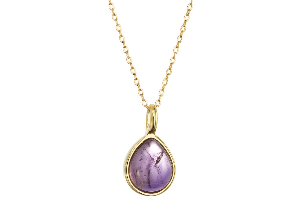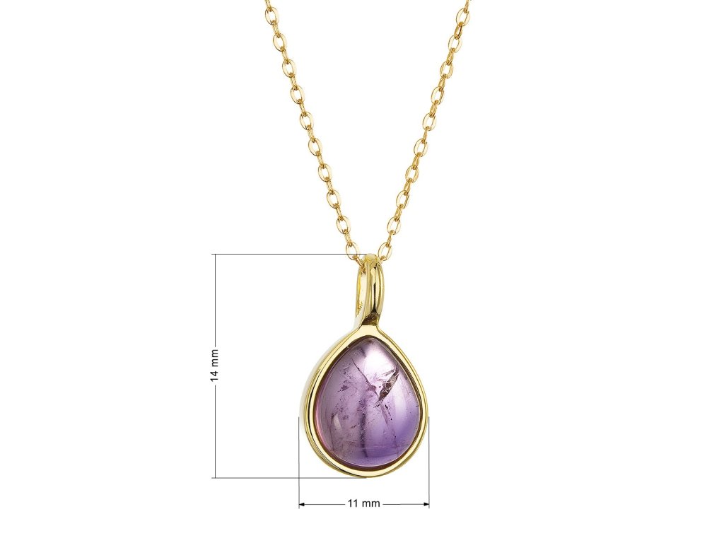 Náhrdelník je vyrobený zo striebra rýdzosti 925/1000 s jemným pozláteným povrchom , ktorý prepožičiava šperku luxusný a teplý lesk. Jeho jedinečný tvar kvapky je precízne zdobený prírodným ametystom vo fialovej farbe, ktorý je lemovaný zlatistou linkou pozláteného striebra.