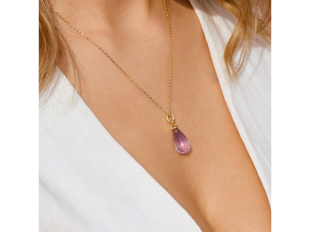Náhrdelník s príveskom je majstrovským skvostom, ktorý dokonale spája čistú eleganciu striebra rýdzosti 925/1000 s jemným zlatým nádychom a očarujúcou krásou vzácneho prírodného ametystu. Luxusný prívesok v tvare pretiahnutej kvapky vás okamžite vtiahne do magického sveta tajomstva, vnútornej sily a nespútanej ženskosti. Každý detail tohto šperku je premyslený tak, aby rozprával príbeh výnimočnosti a krásy.
