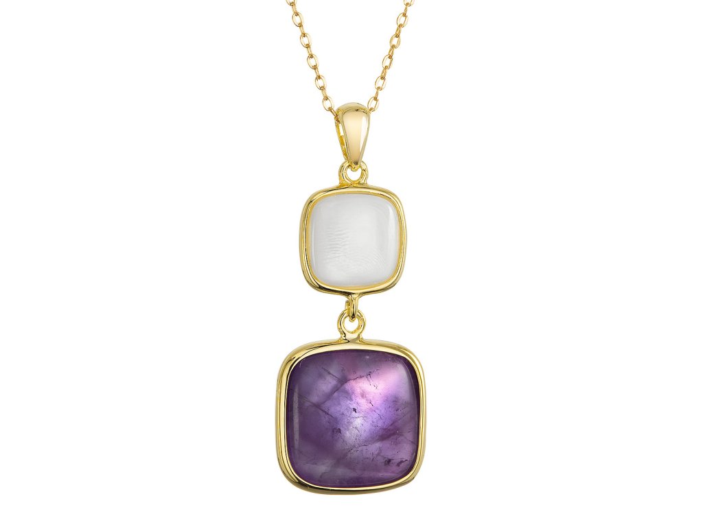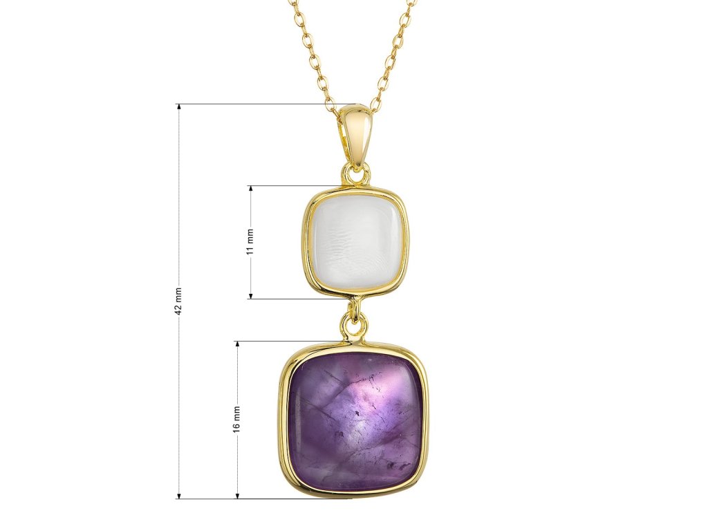Náhrdelník s príveskom je umeleckým dielom, ktoré spája jemný lesk pozláteného striebra 925/1000 s výnimočnou krásou prírodných materiálov. Luxusný prívesok v tvare dvoch nad sebou zavesených štvorcov vytvára jedinečnú kompozíciu - väčší štvorec osadený sýtym fialovým prírodným ametystom symbolizuje hĺbku duchovna a intuície, zatiaľ čo menší štvorec vyplnený jemnou bielou perleťou prináša krehkú eleganciu a vnútorný pokoj.