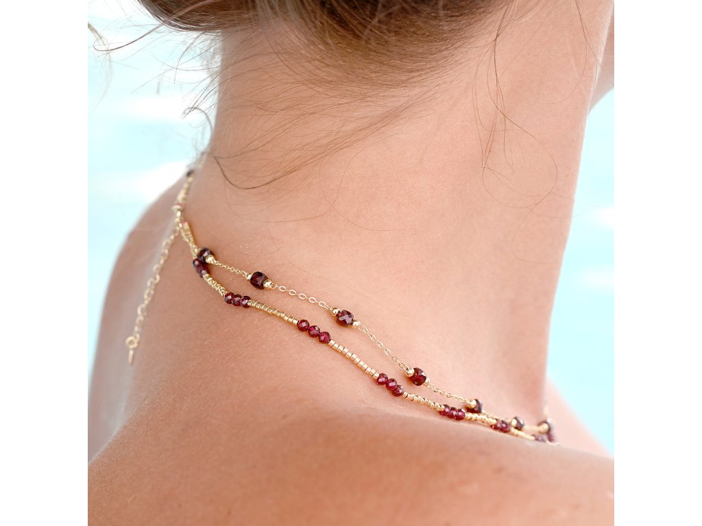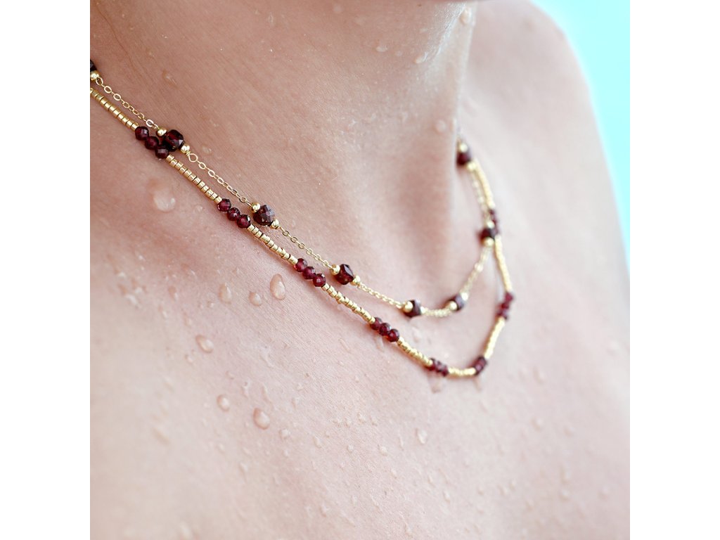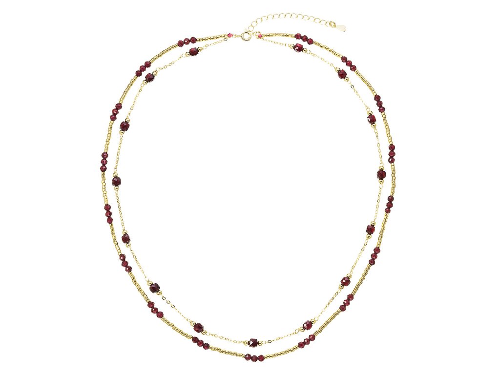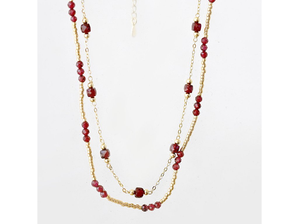 Očarujúce jemný dvojradový náhrdelník s drobnými prírodnými kamienkami granáty pôsobia ľahko a elegantne.