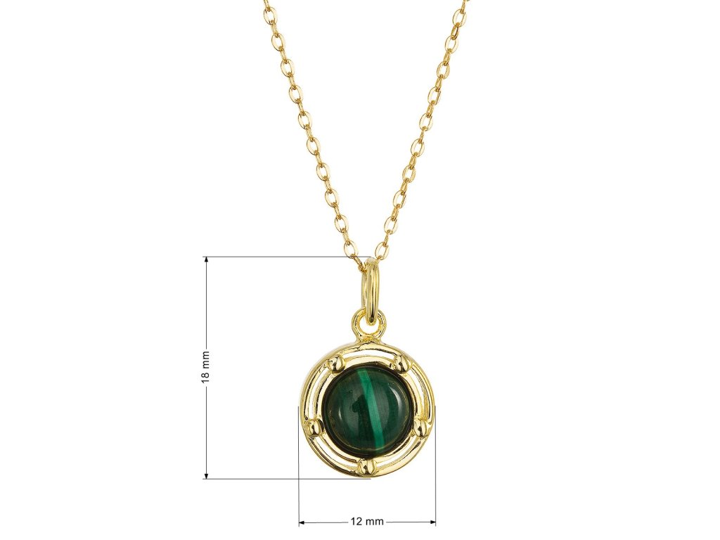Náhrdelník s okrúhlym príveskom je vytvorený zo striebra rýdzosti 925/1000 s pozlátenou úpravou, ktorá dodáva šperku luxusný vzhľad. Precízne zasadený prírodný malachit v sýto zelenej farbe je nežne obomknutý jemným pozláteným okrajom, čím vytvára dokonalú harmóniu farieb a tvarov. Okrúhly prívesok s malachitom septembra uprostred náhrdelníka ako vzácny a tajomný drahokam, ktorý priťahuje pohľady.
