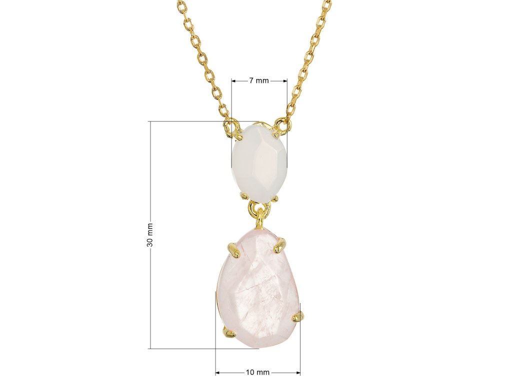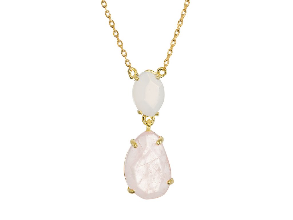 Náhrdelník s príveskom je vytvorený zo striebra rýdzosti 925/1000 s pozlátenou úpravou, ktorá dodáva šperku teplý a luxusný nádych. Precízne zasadené prírodné kamene - menší chalcedón a väčší ruženín - sú umiestnené vertikálne nad sebou a vytvárajú tak dynamickú kompozíciu. Ich jemné odtiene vytvárajú nežný, romantický dojem. Nepravidelné tvary kameňov podčiarkujú ich prirodzenú krásu a jedinečnosť - každý šperk je tak úplne originálny, rovnako ako každý okamih v prírode.