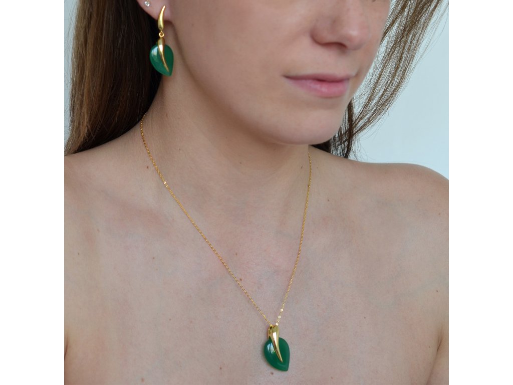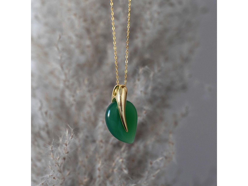 Náhrdelník s príveskom je umeleckým dielom, ktoré zachytáva krehkú poéziu prírodného sveta. Jemne pozlátené striebro 925/1000 nesie luxusný prívesok v tvare dokonalého lístočka z pravého zeleného achátu. Uprostred listu prebieha jemná pozlátená línia, ktorá pripomína subtílnu žilku a dodáva šperku neopakovateľný rukopis prírody.