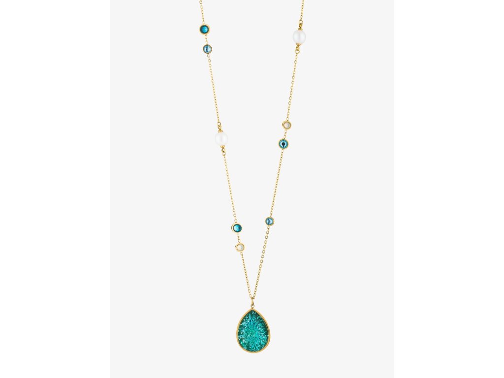 Šperk Lagoon je poctou majstrovskému remeslu a kúzla prírody. Pozlátenému náhrdelníku z chirurgickej ocele dominuje kvapka z českého krištáľu Preciosa , ktorú pre Vás sklári ručne tvarujú v kliešťach nad kahanom – tradičnou sklárskou technikou starou stovky rokov. Kameň v modrozelenom odtieni priezračnej lagúny v sebe ukrýva aj plátok pravého striebra, ktorý krištáľovej kvapke dodáva žiaru a hĺbku. Retiazku z pozlátenej chirurgickej ocele zdobia sklenené perly Preciosa a brúsené krištáľové kamene v hravej kombinácii tyrkysovej a opálovo bielej. Pripomínajú ligot hladiny pri východe slnka. Lagoon je šperkom, ktorý spája históriu a modernú eleganciu.