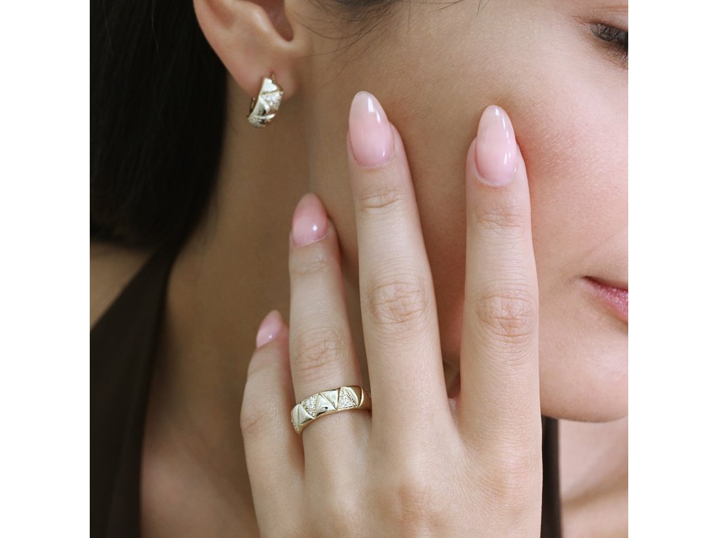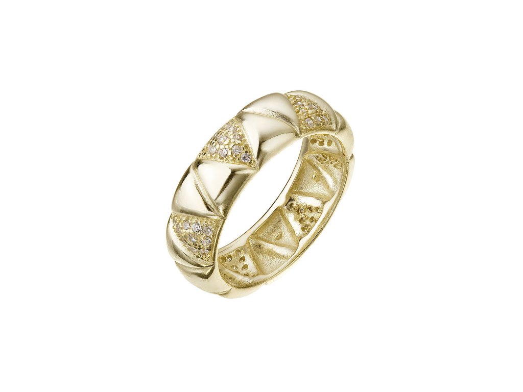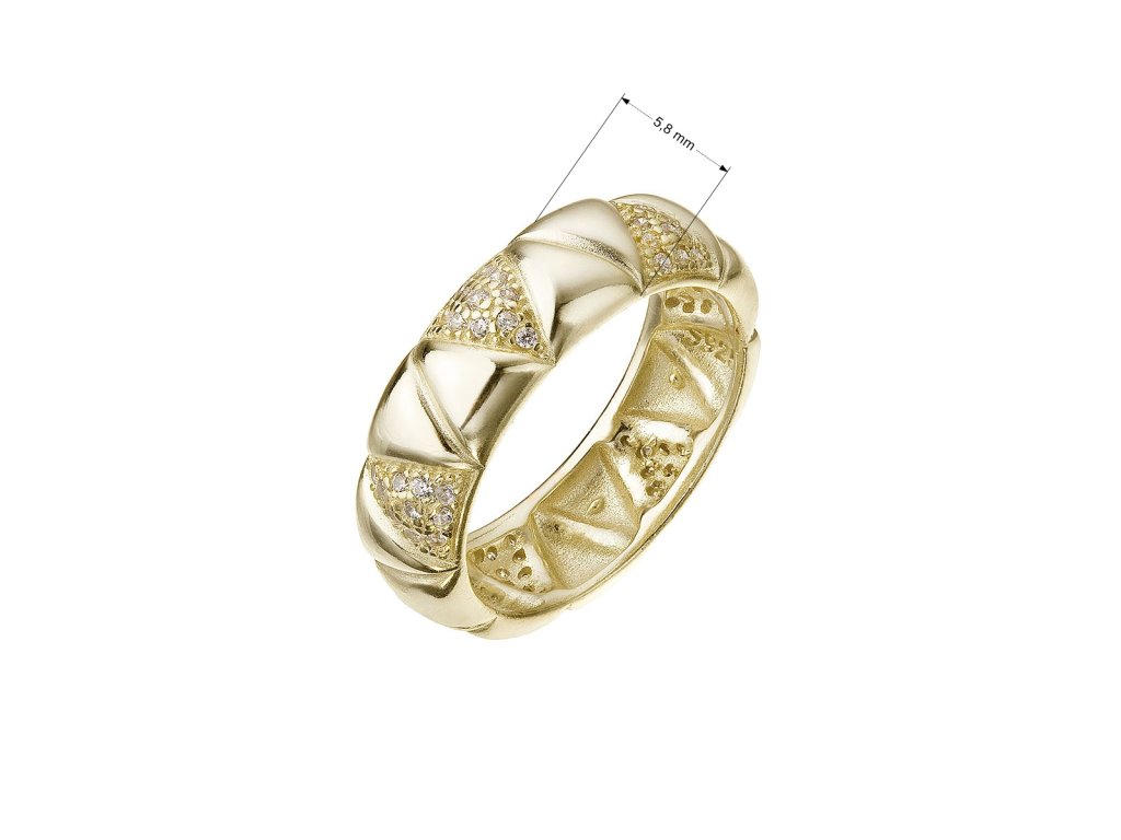Prsteň s čírymi kryštálmi a pozláteným striebrom je symbolom elegancie. Jeho precízny brús a zlatý lesk zaujmú na prvý pohľad.