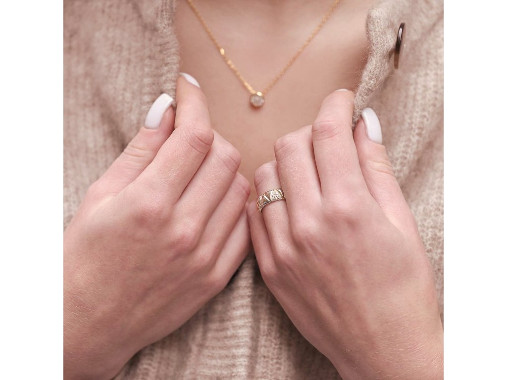 Vyrobený z pozláteného striebra rýdzosti 925/1000, prsteň ponúka dlhú životnosť a odolnosť proti opotrebovaniu. Navyše je prsteň zdobený bielymi zirkónmi. Kombinácia kvalitných materiálov zaisťuje, že prsteň zostane krásny aj po rokoch nosenia.