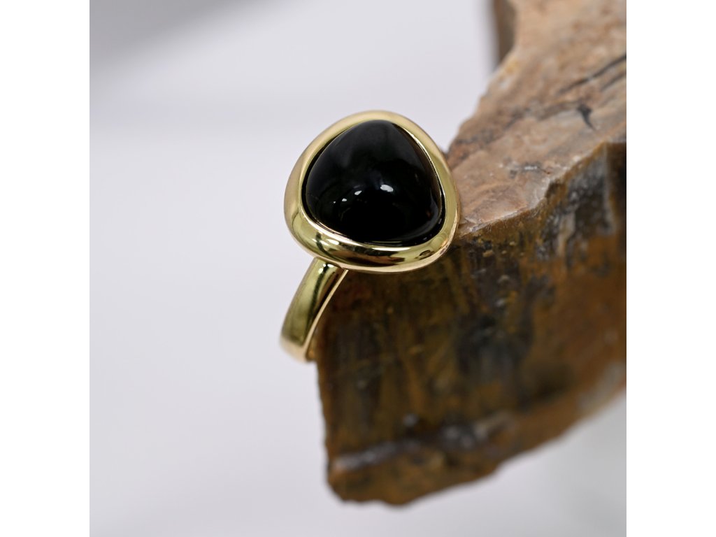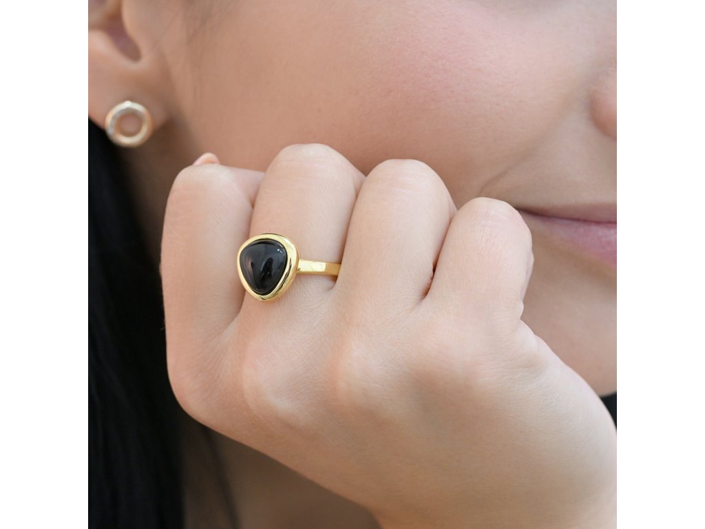 Pozlátený trojuholníkový prsteň s pravým onyxom – symbol vnútornej sily a odvahy , ktorý môžete nosiť.