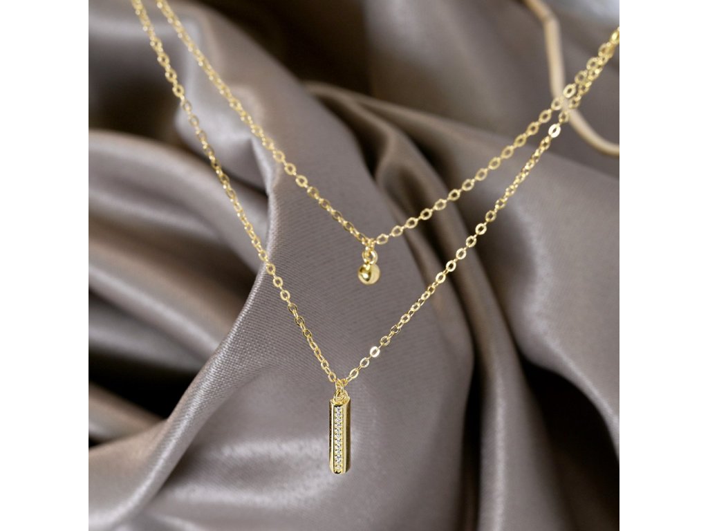 Pozlátený strieborný náhrdelník s obdĺžnikom bohato vysadeným zirkónmi na jednej retiazke a na druhej gulička .